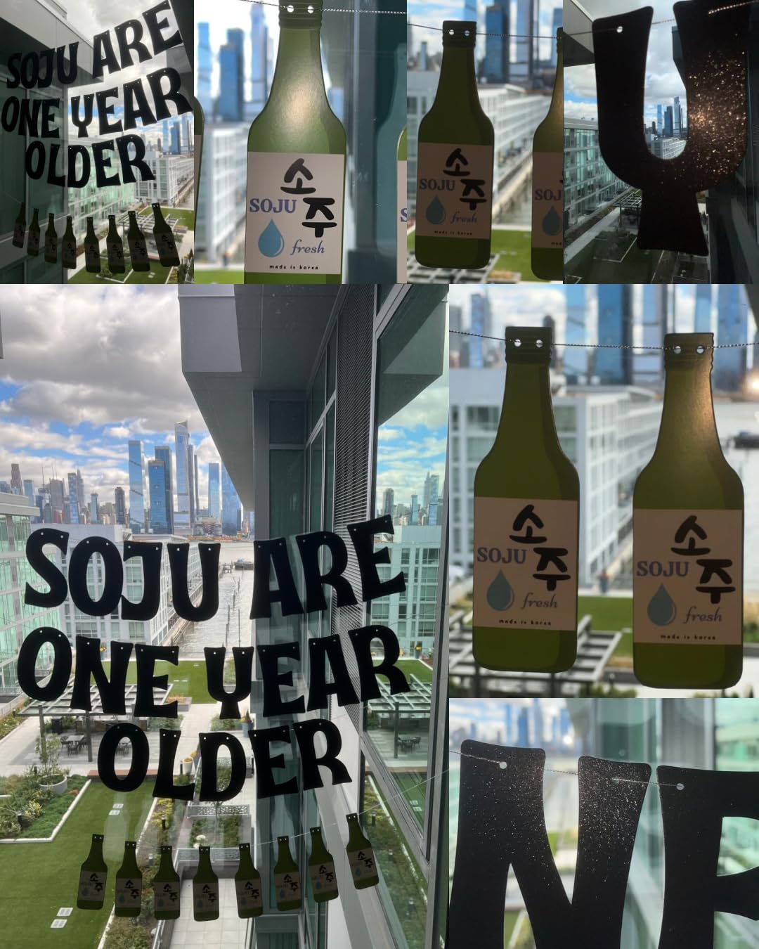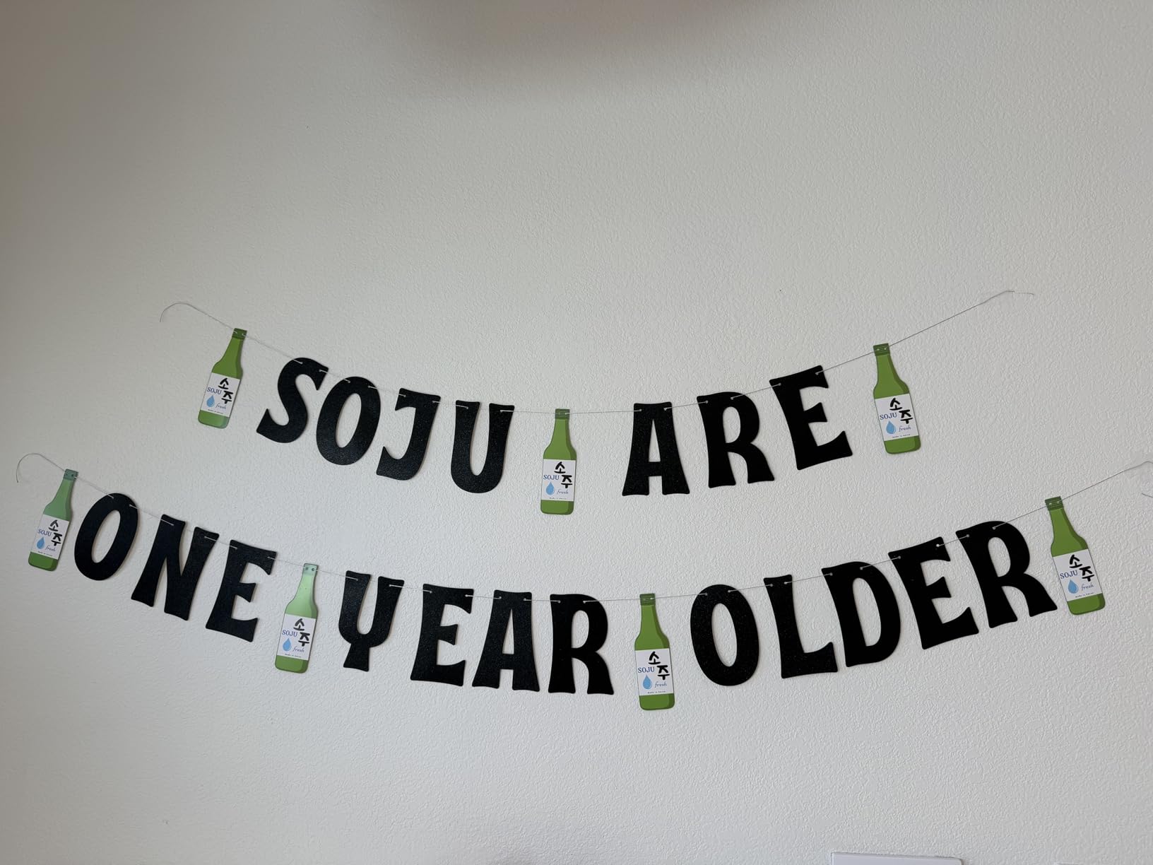 - Includes "Soju Are One Year Older" in black glitter letters (5.5" tall), 8 alcohol bottles (6.3"), 26ft of silver string, and needle for easy assembly