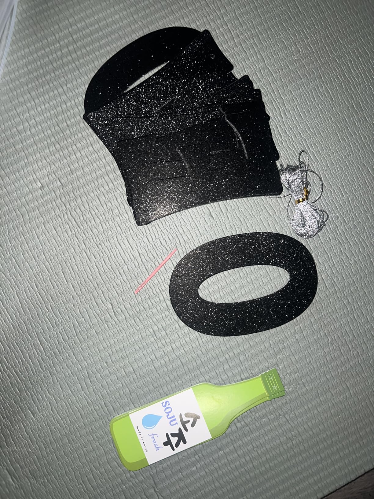 the black letters are made from a thick shimmer cardstock with a fine, flat glitter finish that catches light beautifully but doesn’t shed at all. the soju bottles have a nice gloss to them and look surprisingly realistic for a paper decoration. the overall look feels festive but still neat enough to reuse for future parties, whether it’s a birthday, k-bbq night, or a k-drama watch party.
