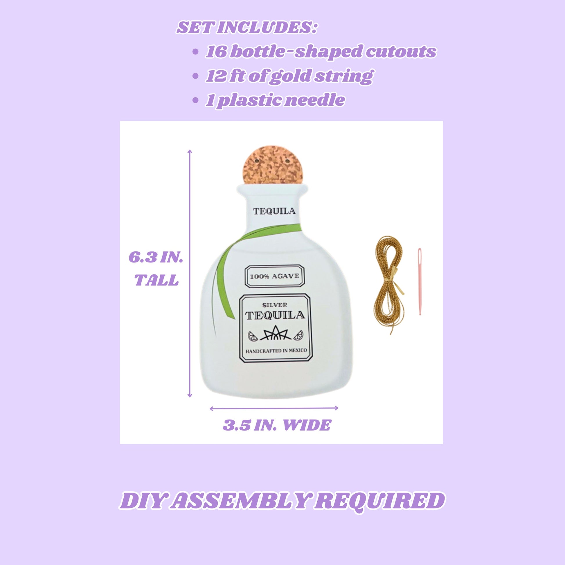 - Set includes 16 alcohol bottle cutouts (6.3 in/16 cm tall), 12ft of gold string, and a needle for assembly. Cut the string to create your desired look